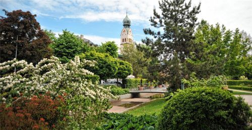 Vor lauter Bäumen im Riedergarten sieht man den Turm der Kirche St. Nikolaus am Ludwigsplatz fast nicht mehr. Die Anordnung der Bäume erweckt den Eindruck, die Kirche würde im Riedergarten stehen – gerade jetzt, da im Sommer das dichte, prächtige Laub der Bäume austreibt. Foto Schlecker