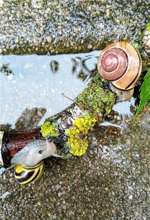 OVB-Leserreporterin Marieluise Pichler aus Rosenheim fotografierte jetzt zwei Schnirkelschnecken im Rosenheimer Stadtteil Mitterfeld, die sich wohl zu einem Ausflug verabredet hatten. Diese Schneckenart ist in Europa weit verbreitet. Foto Pichler