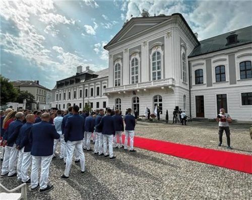 Gabor ist bei den Olympischen Spielen in Tokio, die gestern eröffnet worden sind, wieder offizieller Ausstatter des slowakischen Teams. Die Athleten und Funktionäre – hier zu sehen vor dem slowakischen Präsidentenpalast – werden zu verschiedenen Anlässen in Schuhen des Rosenheimer Unternehmens auftr