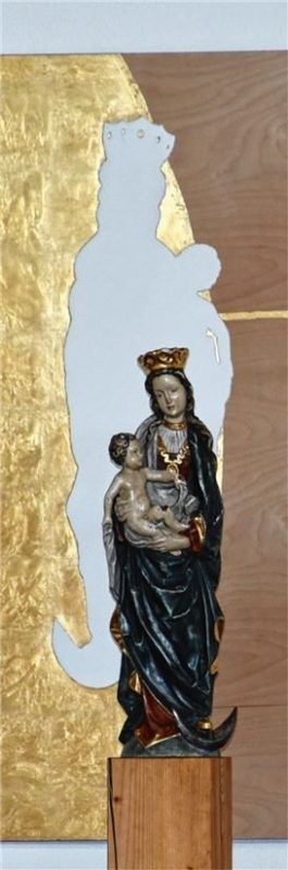 In der Rosenheimer Sankt-Michael-Kirche ist eine neue Marien-Installation eingeweiht worden. Das Kunstwerk des Rohrdorfer Künstlers Jörg Länger zeigt spiegelbildlich im Hintergrund den Umriss der Marienstatue im Vordergrund. Diese weiß gebliebene Silhouette bezeichnet Länger als Urgrund, der dem Bet