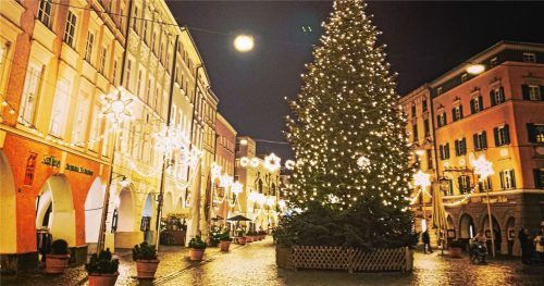 Hell erleuchtet zeigt sich der Rosenheimer Max-Josefs-Platz zum bevorstehenden Beginn des Weihnachtsfestes. Passend dazu gibt es seit einigen Tagen frostige Temperaturen. Und nicht zuletzt sorgt auch der hell erleuchtete Weihnachtsbaum der Stadt in der Mitte der Fläche für die nötige Stimmung in der