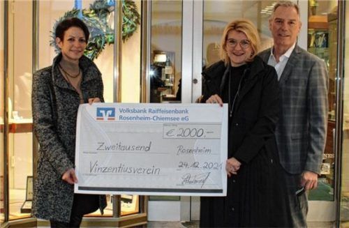 Der älteste Sozialverein Rosenheims, der Vinzentius-Verein, freut sich über die jährliche Spende der Firma Juwelier Krumtünger über 2000 Euro. Andrea und Thomas Treibenreif (rechts) war es schon immer ein Anliegen, in der Region Gutes zu tun. Andrea März (links), die Vorsitzende des Sozialdienstes,