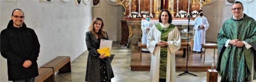 Als Lektorin und Kommunionhelferin stellte sich beim Sonntagsgottesdienst in Heilig Blut Alexandra Konawok (Zweite von links) vor. Zusammen mit der Urkunde des erzbischöflichen Ordinariats und im Beisein von (von links) Thomas Bullinger, verantwortlich für Lektoren der Pfarrei, sowie Gemeindereferen