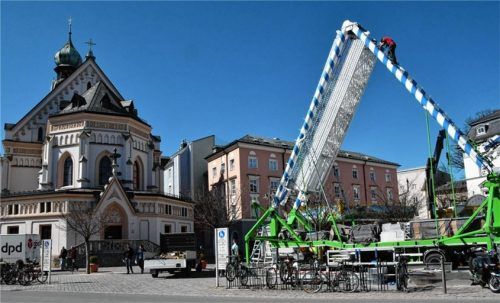 Auf dem Ludwigsplatz laufen die Vorbereitungen für den „Frühling in Rosenheim“ auf Hochtouren. Max Fahrenschon junior baut hier – gemeinsam mit Mitarbeitern der Firma „Lamberink“ – ein 24 Meter hohes Riesenrad auf. Wie berichtet, hat das Riesenrad 16 Gondeln, die Platz für je vier Personen bieten. N