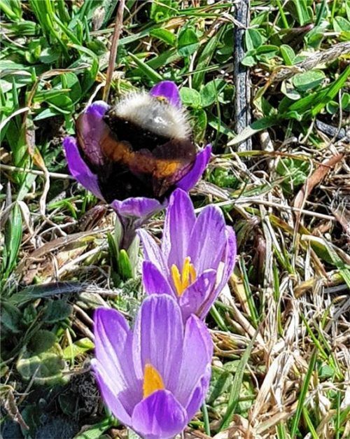 Ein Festmahl wartete für diese Hummel auf dem Heuberg. Um an den Nektar zu gelangen, zwängte sie sich in die Krokusblüte. Das Foto nahm unsere Leser-Reporterin Anita Uhl aus Rosenheim auf. Foto Uhl