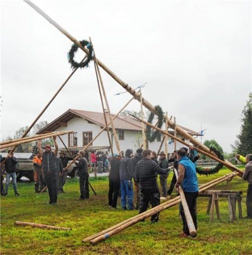 Ein rund 30 Meter langer Hochzeitsbaum zu Ehren von Anna-Lena und Johann Schwaiger schmückt seit Samstag das Moar-Anwesen in Aising. Traditionsgemäß haben ihn die Männer aus dem Stadtteil aufgestellt. Trotz des Regens zog der seltene Brauch zahlreiche Schaulustige an. Gestiftet hatte den Baum ein Na