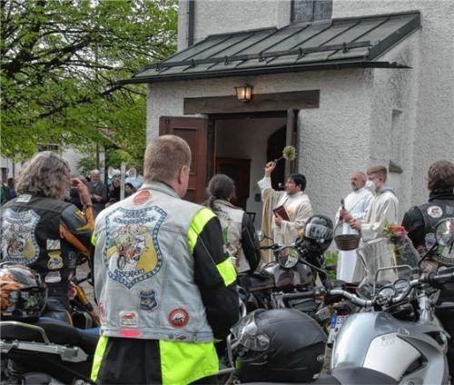 Trotz des schlechten Wetters kamen 15 Biker mit ihren mit Blumensträußen geschmückten Maschinen zur Motorradweihe an der Rosenkranzkirche im Rosenheimer Stadtteil Fürstätt. Nach der Segnung durch Kaplan Gracious Chirattolickal und Diakon Erwin Brader ging es für die Männer des Motorradclubs „Griabig