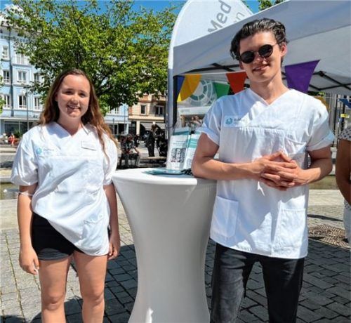 Im Rahmen des internationalen Tages der Pflege konnten sich Passanten am gestrigen Donnerstag an einem Stand der Romed-Kliniken am Ludwigsplatz von den Auszubildenden Lena Oberfuchshuber (links) und Niklas Rist die Blutdruck- oder Sauerstoffwerte messen lassen. Bei einer Tasse Kaffee berichteten sie