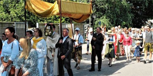 Für den Glauben auf die Straße zu gehen, dazu rief Domkapitular Dekan Daniel Reichel auf. Seiner Einladung zur Fronleichnamsprozession durch Pang und Aising folgten zahlreiche Gläubige aus dem Rosenheimer Süden, Vereine samt ihren Fahnenabordnungen sowie einige Stadträte. Bei hochsommerlichen Temper