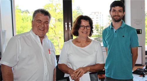 Zum 40. Dienstjubiläum gratulierten Kreisgeschäftsführer Martin Schmidt (links) und Verwaltungsleiter Sebastian Berthel (rechts) Christine Retzer, Leiterin der Buchhaltung beim BRK-Kreisverband. „Eigentlich wollte ich mir nach dem Abitur bis zu Studienbeginn nur etwas dazu verdienen“, so Retzer. Es