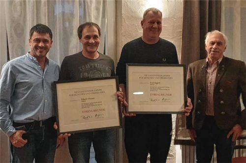 Im Rahmen einer Betriebsfeier der Zimmerei Franz Baumann KG wurden Erhard Maurer (Zweiter von links) für 30 Jahre und Sven Eggert (Zweiter von rechts) für 20 Jahre Betriebszugehörigkeit als Zimmerer Facharbeiter geehrt. Der Firmeninhaber Franz Baumann junior (links) bedankte sich zusammen mit Franz