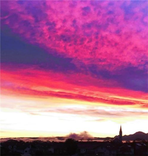 Diesen tollen Sonnenaufgang hat Leser-Reporterin Uschi Unterlinner aus Rosenheim mit ihrer Kamera festgehalten: Über der Panger Pfarrkirche Mariä Himmelfahrt färbte sich der Himmel in prächtigen Farben und brachte Licht in den Abend.Foto Unterlinner