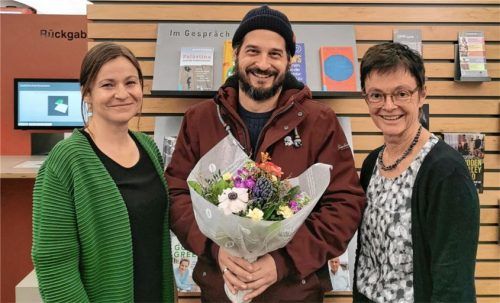 Die stellvertretende Leitung Susan Lauke (links) und Susanne Delp von der Stadtbibliothek Rosenheim empfingen am Donnerstag Dennis Steinberg mit einem Blumenstrauß. Seine Beziehung zur Stadtbibliothek beschreibt der fünfmillionste Besucher mit den Worten: „Meine Familie und ich gehen sehr gerne in d