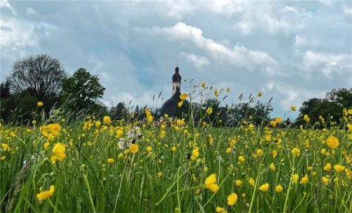 Hinter frühlingshafter Vegetation mit sattem Grün und goldgelben Blüten en masse spitzt die Kirche in Westerndorf am Wasen mit ihrem Zwiebelturm empor. Der wechselhafte Himmel verwandelt die Umgebung in eine wunderliche Kulisse. Dem Betrachter bietet sich dieser Tage ein wildromantisches Flair. Foto