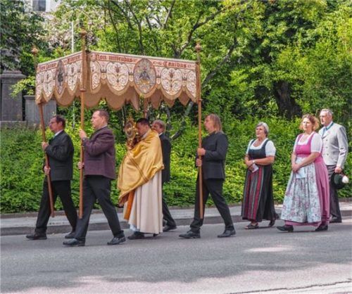 Feierlich war der Gottesdienst zum Fronleichnamsfest in der Pfarrkirche Mariä Himmelfahrt. Musikalisch umrahmten der Kirchenchor unter Leitung von Andreas Penninger und die Wasner Musi mit Hans Rutz die Messe. Prächtig war die Prozession, die im Anschluss durch Pang und Aising zog. Den Baldachin, un