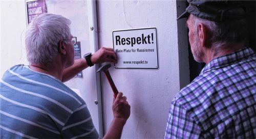 Am linken Zentrum in der Innstraße 45a in Rosenheim wurde ein Schild mit der Aufschrift „Respekt! Kein Platz für Rassismus“ angebracht. Über 2000 Schilder zieren bereits Gebäude wie kommunale Einrichtungen, Sportstadien und Betriebsstätten. GEW-Gewerkschafter Andreas Salomon (rechts) und Bernhard We