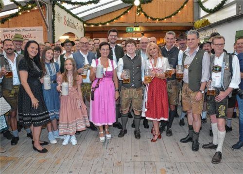 Sowohl im Flötzinger-Festzelt (Bild links) als auch in der Auerbräu-Festhalle floss das Festbier schon einen Tag vorm Wiesnstart. Anlass war die traditionelle Bierprobe – für die beiden Brauereien der interne Start des Rosenheimer Herbstfestes. Zur Musik von der „Dreder Musi“ und der „Riesenberg Mus