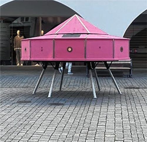 Auf dem Max-Josefs-Platz in Rosenheim ist ein Ufo gelandet! Das quietschrosa Flugobjekt stammt aber nicht aus dem Weltall, sondern vom Künstlerkollektiv Pinkparadise. Hinter den Bullaugen befinden sich verschiedene Werke der Künstler. Zu bestaunen ist die fliegende Untertasse noch bis heute auf dem