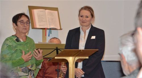 Für Klinikseelsorgerin Monika Eichinger (rechts) war es ein besonderer Moment: Gemeinsam mit ihrem Kollegen Pfarrer Dr. Klaus Wagner-Labitzke und Künstlerin Siglinde Berndt (links) eröffnete sie die neue Ausstellung in der Klinikkapelle im Romed-Klinikum. Zu sehen ist eine bewegende Kunstinstallatio