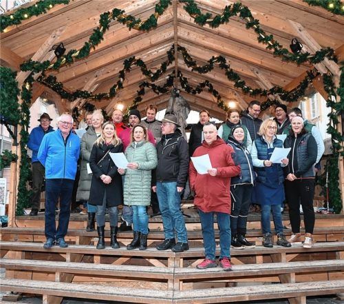 Ganz traditionell trafen sich an Heiligabend auch heuer wieder die Marktbeschicker vom Christkindlmarkt und Vertreter des Wirtschaftlichen Verbandes zum gemeinsamen Singen von Weihnachtsliedern mit den Hinterberger Musikanten auf der Christkindlmarkt-Bühne. Dieser Termin setzt auch heuer den Schluss