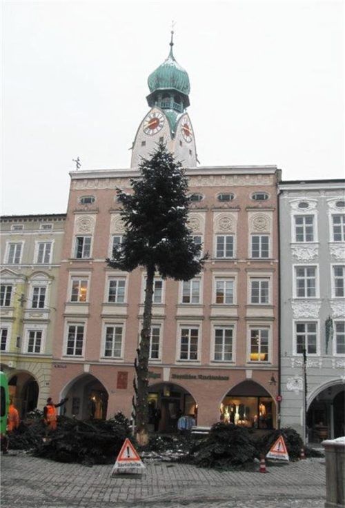 Es war ein eher trauriges Bild, das der Rosenheimer Christbaum, der in der Weihnachtszeit die Bürger der Stadt mit seiner üppigen Nadelpracht erfreut hatte, in seinen letzten Stunden abgegeben hat. Das lag freilich nicht am Baum, sondern an den Arbeitern, die die hohe Tanne am Mittwoch untenrum „nac