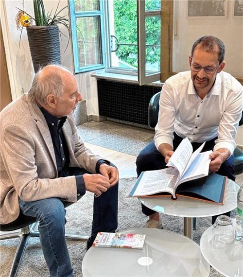 Autor und Regisseur Horst Rankl (links) hat Oberbürgermeister Andreas März das Rollenbuch des diesjährigen Historischen Stadtspiels überreicht. März ist Schirmherr und freut sich, dass das Theater Rosenheim auch heuer großen Aufwand betreibt: „Die vielen Schauspielerinnen und Schauspieler machen die