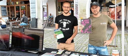 Auf „Missstände in der Milchindustrie“ wollte die Ortsgruppe Rosenheim des Vereins „Ariwa“ mit ihrem Stand auf dem Max-Josefs-Platz aufmerksam machen. Ziel war es, am deutschlandweiten Aktionstag unter dem Motto „Lasst die Kuh los“ gegen die noch immer praktizierte Anbindehaltung zu protestieren.Fot