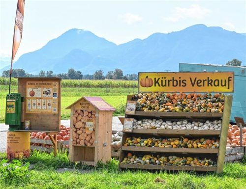 Im Herbst ziehen leuchtende orangene, grüne und gelbe Kürbisse die Blicke auf sich, so auch in und um die Stadt Rosenheim. Unser Bild entstand in Pang nach dem Kreisel. Während viele Früchte auf den Feldern durch Hitze oder Feuchtigkeit verkümmerten, scheint das den Kürbissen nichts ausgemacht zu ha