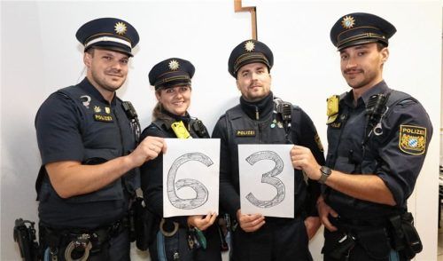 Das ist eine sehr erfreuliche Zahl: Die Beamten auf der Wiesn-Wache zeigen hier die 63 – für 63 Wiesn-Verbote für „Radau-Briada“, die auf dem Herbstfest 2024 fällig waren. Zum Vergleich: 2023 waren es 84 und 2022 sogar 119 Wiesn-Verbote. Von links: der stellvertretende Wiesn-Wachleiter, Kommissar Si