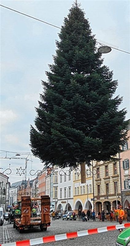 Der Christbaum ist der Mittelpunkt des Christkindlmarkts. Gestern wurde er aufgestellt. Heuer kommt der Baum aus dem Stadtteil Kastenau. Die Nordmanntanne wiegt rund 3,2 Tonnen und ist gut 14 Meter hoch. Eskortiert wurde sie von einem Polizeiauto. Auf dem Max-Josefs-Platz wurde die Tanne mittels Kra