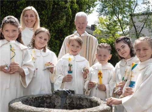 In der Stadteilkirche Rosenheim-Inn haben sich 45 Kinder aus den Pfarreien St. Nikolaus (links), St. Hedwig (Mitte) und Hl. Familie Kastenau (rechts) seit Advent mit Weggottesdiensten und zahlreichen Gruppenstunden auf ihre Erstkommunion vorbereitet. Unter dem Motto „Kommt und esst“ wurde dieser gro