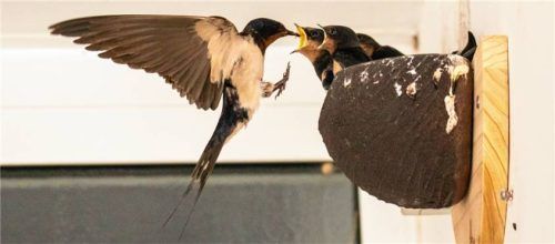 Fütterungsanflug beim letzten besetzten Rauchschwalbennest in der Fußgängerzone – kurz bevor die Jungen flügge wurden. Wenig später wagten sie ihre ersten Flugversuche in der Heilig-Geist-Straße: zunächst nur kurze Strecken – etwa zum benachbarten Bierfasstisch und zu den Stuhllehnen des Ramen-Resta