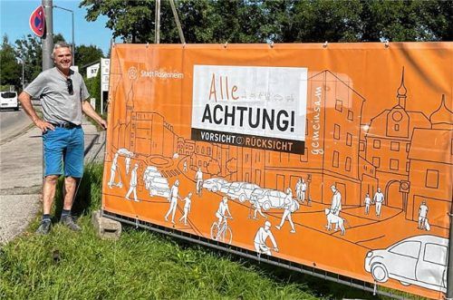 „Alle Achtung!“ ist eine von der Stadt Rosenheim unterstützte Aktion für mehr Rücksichtnahme und Vorsicht im Straßenverkehr. Der Radverkehrsbeauftragte der Stadt Rosenheim Olaf Fröhlich (unser Bild) freut sich über die erste Bauzaunwerbung für die Aktion. Inhalt der Aktion ist, das wir nur gemeinsam