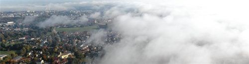 Der Frühnebel wallt durch das Inntal, liegt zäh und dicht über den Feldern. Doch just in dem Moment, als die Drohne unseres Fotografen ihre Kameralinse auf die Aisinger Kirchturmspitze schwenkt, bricht ein Sonnenstrahl durch die Wolken und gibt diesen Blick frei. Foto Ziegler