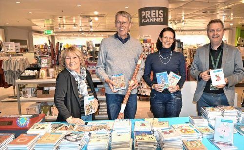 Waltraud Weber und Dr. Stephan von Koskull von Unicef, Schirmherrin Andrea März und Galeria-Filialleiter Jens Steinbrecher (von links) freuen sich über die Eröffnung des Unicef-Standes bei Galeria Rosenheim. Bis Freitag, 20. Dezember, können Rosenheimerinnen und Rosenheimer dort Grußkarten, Kalender