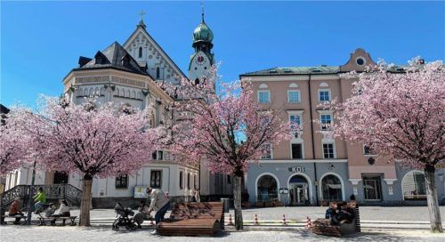 In voller Blütenpracht präsentieren sich die japanischen Zierkirschenbäume auf dem Rosenheimer Ludwigsplatz, ein Blickfang für alle Menschen am Stadtbach. Gepflanzt wurden diese Bäume als Zeichen von Rosenheims Städtepartnerschaft mit Ichikawa, einer Stadt in Japan, an die gerade in dieser Blütezeit