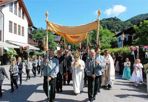 Mit einer farbenfrohen Prozession und einem Gottesdienst haben in Nußdorf viele Hundert Katholiken das Fronleichnamsfest, das Hochfest des Leibes und Blutes Christi, gefeiert.Foto stv