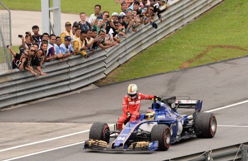 Sepang – Die große Show von Sebastian Vettel endete mit einem demolierten Ferrari auf drei Rädern und dem dem tapferen WM-Verfolger als Beifahrer auf dem Sauber von Landsmann Pascal Wehrlein. Ein Crash nach der Zieldurchfahrt beim Großen Preis von Malaysia, in dem Vettel sensatio