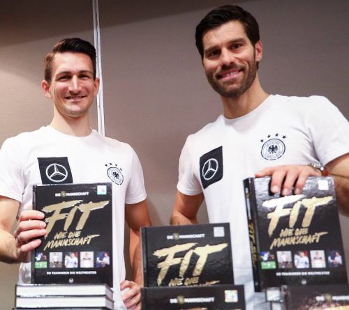 Die beiden Athletiktrainer der deutschen Fußball-Nationalmannschaft, Niklas Dietrich (l.) und Yann-Benjamin Kugel, haben ein Buch geschrieben, das auch Hobbysportlern helfen soll, sich mit Übungen in Form zu bringen beziehungsweise zu halten. „Fit wie die Mannschaft“ lautet der Titel, die Idee trug