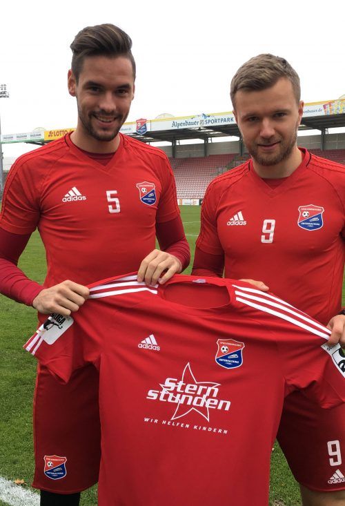 Die SpVgg Unterhaching, bisher in der Dritten Liga „oben ohne“, nutzt die Zeit ohne Hauptsponsor für einen guten Zweck: Bis Weihnachten laufen Kapitän Josef Welzmüller (l.), Torjäger Stephan Hain (r.) und Kollegen mit dem Logo der Benefizaktion „Sternstunden – Wir helfen Kindern“ auf der Brust auf.