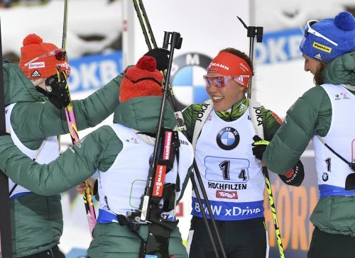 Hochfilzen – Laura Dahlmeier konnte endlich wieder lachen. Zusammen mit Vanessa Hinz, Franziska Hildebrand und Maren Hammerschmidt durfte die siebenmalige Weltmeisterin beim Biathlon-Weltcup in Hochfilzen doch noch ganz oben auf das Podest klettern und hat ihre Ambitionen auf Oly