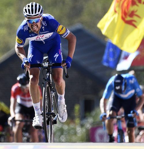 Lange Zeit war der Klassiker La Fleche Wallonne ganz im Zeichen des Berliners Maximilian Schachmann gestanden – doch am Ende stand dessen Quickstep-Teamkollege Julian Alaphilippe (li.) im Rampenlicht. Der 24-Jährige, der 2015 und 2016 jeweils schon Zweiter geworden war, hatte am finalen Schlussansti