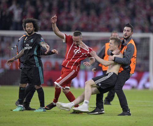 Ungebetene GästeGleich ein halbes Dutzend Flitzer stürmte nach dem Abpfiff den Rasen. Einer war nach einem Lauf über den halben Platz erst einzufangen, als er bei Franck Ribery und Marcelo ankam und den Franzosen fast zu Boden riss. „Sowas sollte nicht passieren“, fand Real-Spieler Toni Kroos: „Man