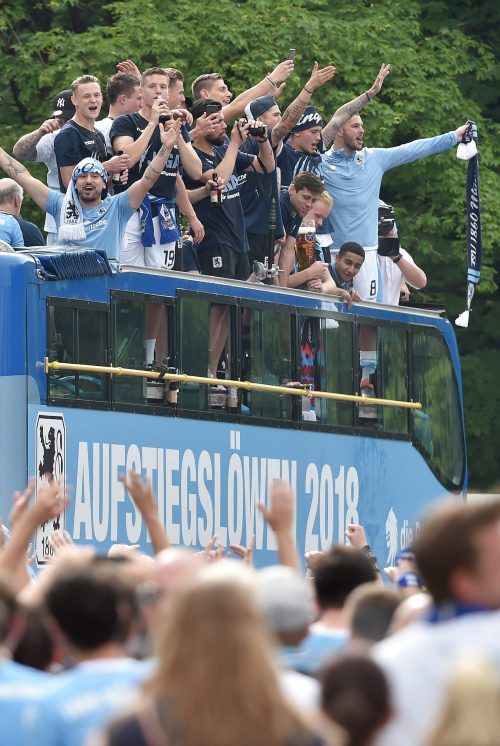 Statt auf dem Rathausbalkon haben die Löwen den Aufstieg auf einem Doppeldeckerbus gefeiert (Foto: dpa) – zum Treffen mit dem OB wird es dennoch kommen. „Im Namen des Stadtrats der Landeshauptstadt München und ganz persönlich gratuliere ich Ihnen und dem TSV 1860 München sehr herzlich zum Aufstieg i