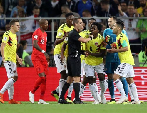 Um den Punkt gebracht Johan Mojica (links hinter dem Schiedsrichter Mark Geiger) hatte beim Spiel Kolumbien gegen England einen perfiden Plan, der zum Glück nicht aufging: Während seine Kollegen den Unparteiischen nach einem Elfmeterpfiff umzingelten, nutzte er die Rudelbildung, um – vermeintlich un