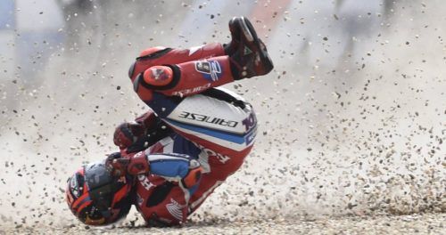 Spektakulärer Kurzauftritt Stefan Bradl aus Zahling startete mit besten Vorsätzen in den zehnten Lauf der Motorrad-WM im tschechischen Brünn. Dann das: Kollision mit zwei Kollegen, Sturz in der ersten Runde, ausgeschieden. Aber: alles heil geblieben beim MotoGP-Piloten vom Team Honda. Foto: dpa