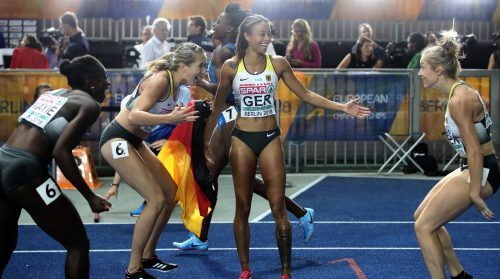Fidele RasselbandeHochstimmung herrschte wieder einmal bei Lisa-Marie Kwaye, Rebekka Haase, Tatjana Pinto und Gina Lückenkemper. Das deutsche Quartett ersprintete sich Staffel-Bronze. Foto: dpa