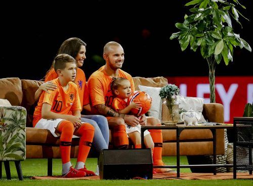 Amsterdam – Die ersten Minuten seines Ruhestands erlebte Wesley Sneijder in aller Öffentlichkeit. Mitten in der riesigen Amsterdamer Arena standen ein Sofa und ein Fernseher, der 34-Jährige hatte es sich dort gemütlich gemacht, sah mit seiner Frau und den zwei Kindern Karriere-Highlights und Grußbot