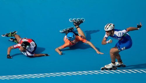 Bei den Olympischen Jugend-Sommerspielen in Buenos Aires profitierte der italienische Speedskater Vincenzo Maiorca (r.) vom Malheur seiner Rivalen Chiawei Chang (Taiwan) und Merijn Scheperkamp (Niederlande), die er nach deren Kollision im Sauseschritt mühelos überholen konnte. Für Deutschland gab es