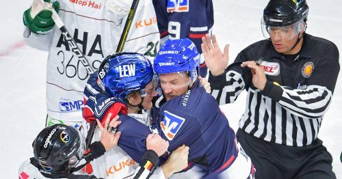 Sie sind derzeit nicht zu schlagen, die Adler Mannheim – in keiner Hinsicht. So wie sich die Mannschaft in den vergangenen acht Spielen mit jeweils einem Sieg nach sechzig Minuten durchsetzte, erwies sich auch Stürmer Marcus Kink (blaues Trikot) bei diesem Handgemenge mit dem Augsburger Patrick McNe